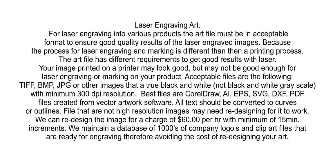 is permanently custom etched or engraved into most metals, woods and some plastics. The image will not scratch or rub off. Our computer controlled process can scan, capture and engrave almost any image including logos, graphics and text. Custom laser engraving not only means that we provide personalized laser engraving for our own stock selections, it also means that we do client supplied items and other custom work. We want to fulfill your engraving needs! If you have something that you would like engraved, you can send it to us. There are many materials that can be engraved and most materials can be received for engraving within 72 hours. So whether it's our stock item or your own items, specialized materials or even something that you would like made special just for your application, give us a call! Frequently Asked Questions What material can we engrave?