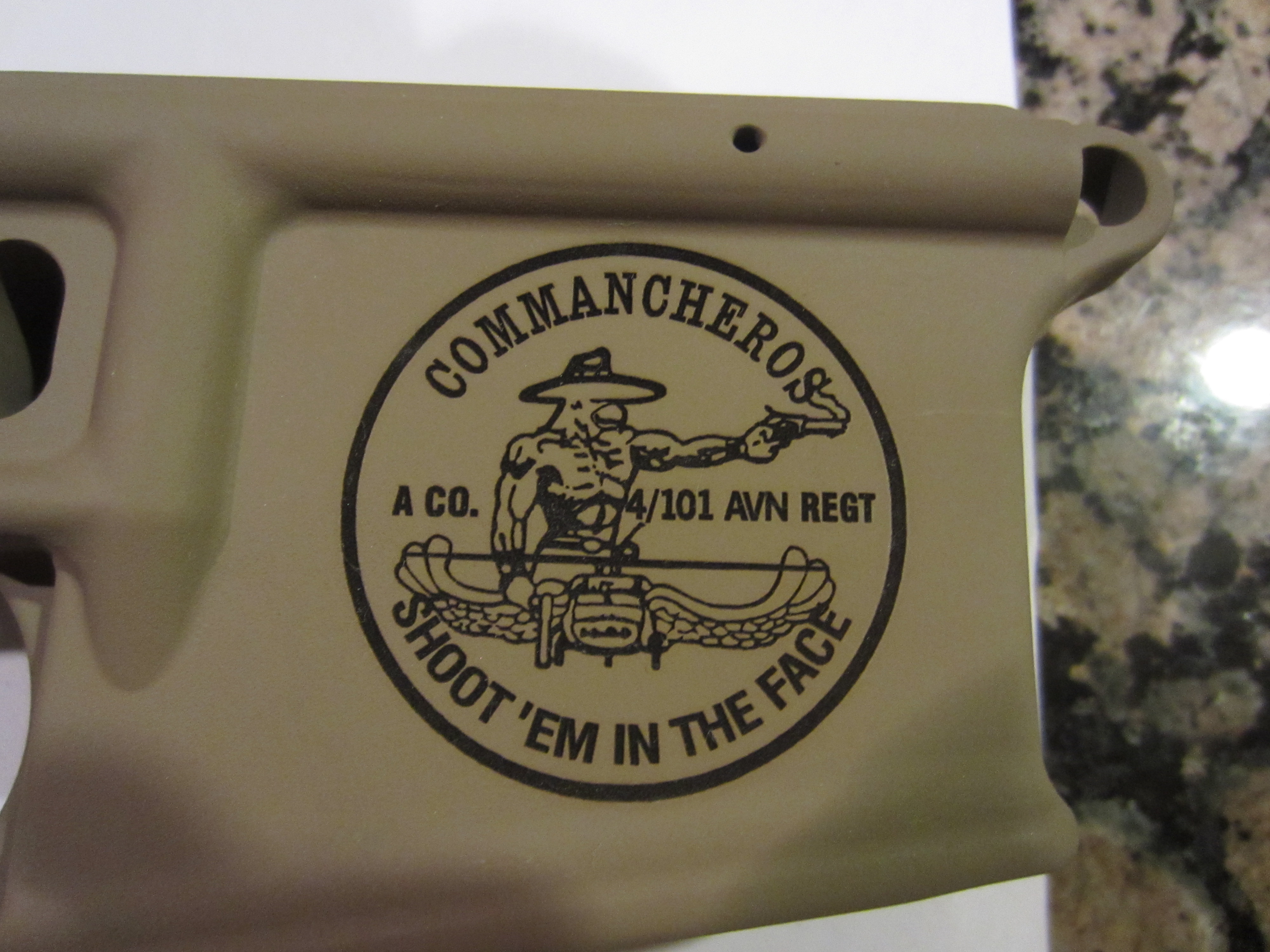 | Firearm Engraving With Laser (Deep or Etch) Trust Name Engraving: Cost is $50.00 (1, 2, or 3 line) Logo Engraving (Deep Engrave) on right side of AR lower: Cost is $75.00 plus any art processing required for laser to engrave it on gun. Custom Engraving: Cost is based on laser engrave time and any required art processing. Text is not art. |